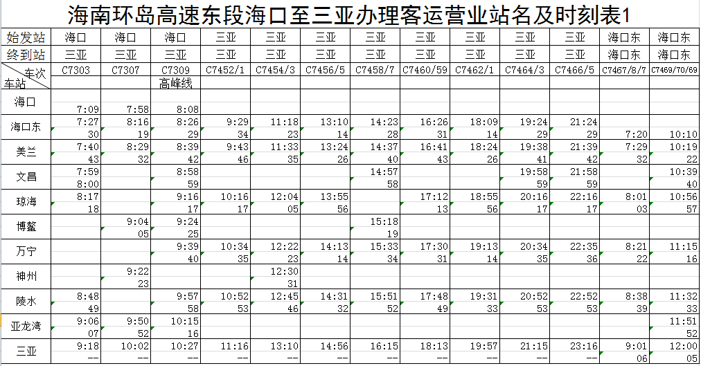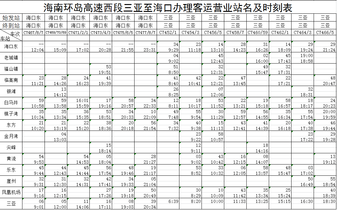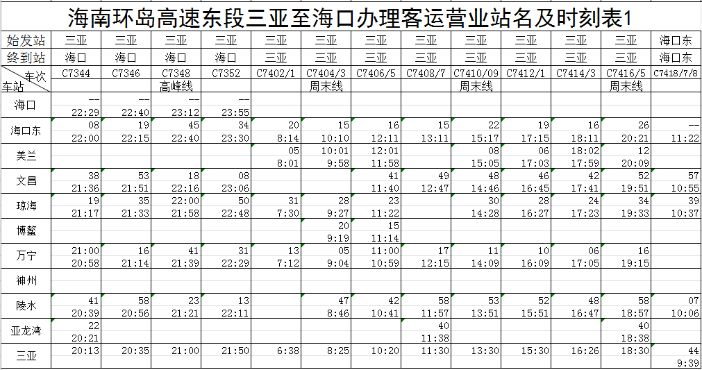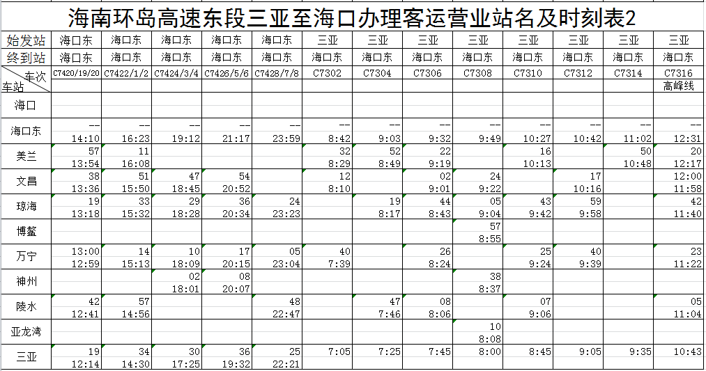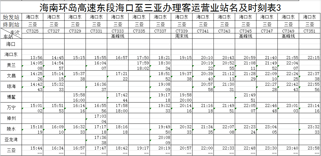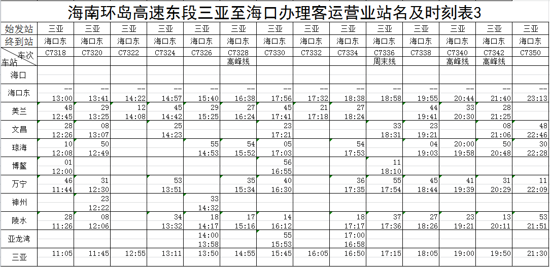 新列車運行圖周一至周四開行“C”字頭動車組列車32.5對,其中環島高鐵東段本線車20對,三亞-三亞環島車6.5對、海口東-海口東環島車6對。周五至周日開行“C”字頭動車組列車35對,其中環島高鐵東段本線車21對,三亞-三亞環島車8對、海口東-海口東環島車6對。