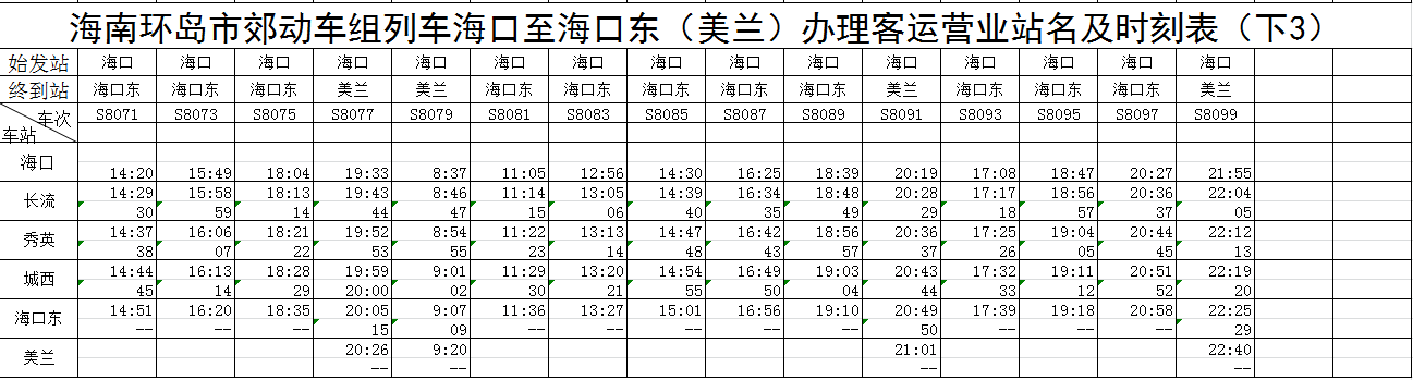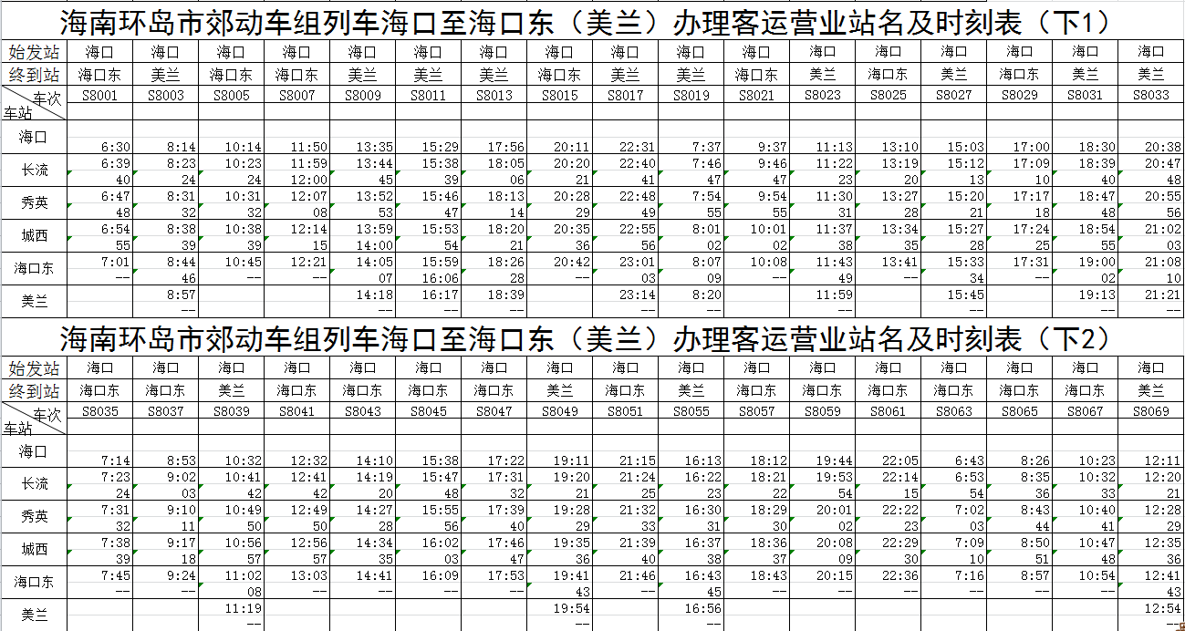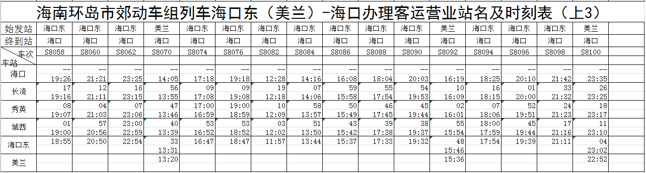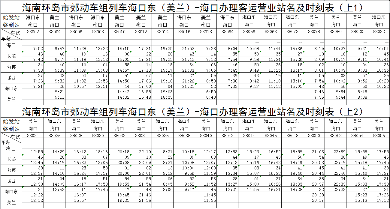 據介紹,新圖運行后,周一至周四開行“S”字頭市郊列車40.5對,其中海口-海口東26對,海口-美蘭14.5對。周五至周日開行“S”字頭市郊列車49.5對,其中海口-海口東31對,海口-美蘭18.5對。