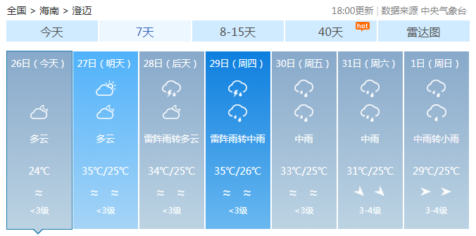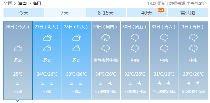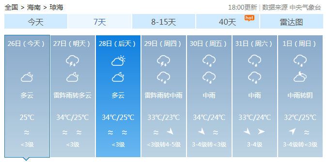 海南省氣象局預(yù)計,8月26日~29日,全島以多云天氣為主,局地有雷陣雨;8月30日~9月1日,受熱帶氣旋影響,海南島陸地和近海將有一次強風(fēng)雨天氣過程。