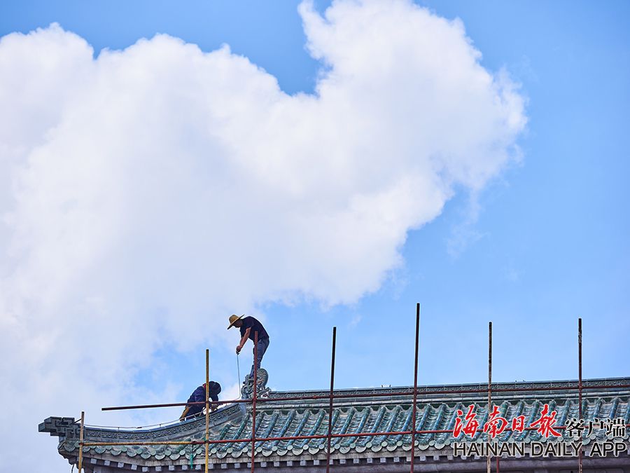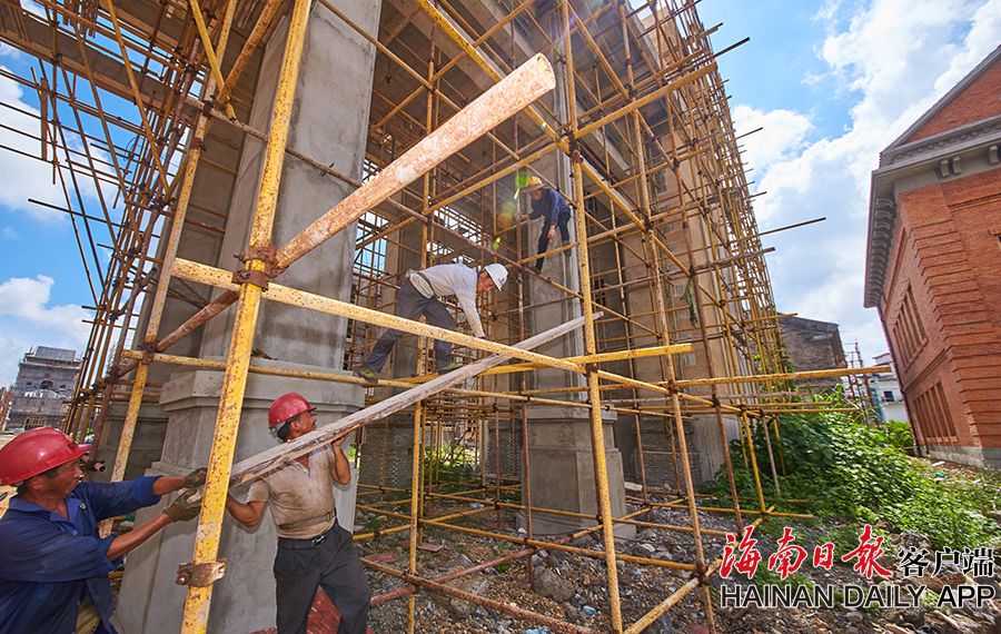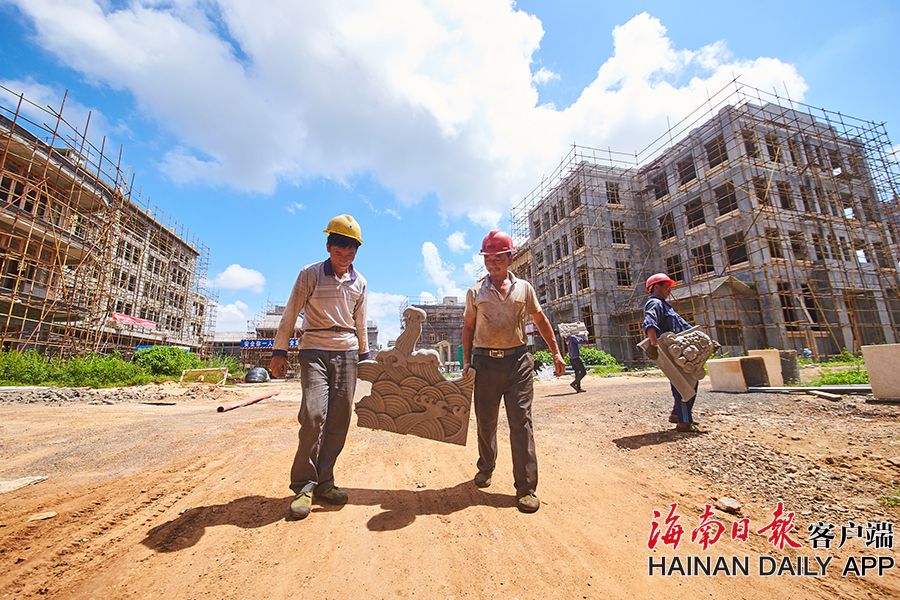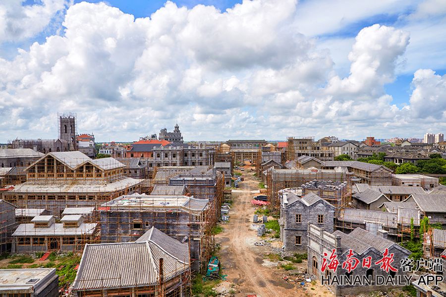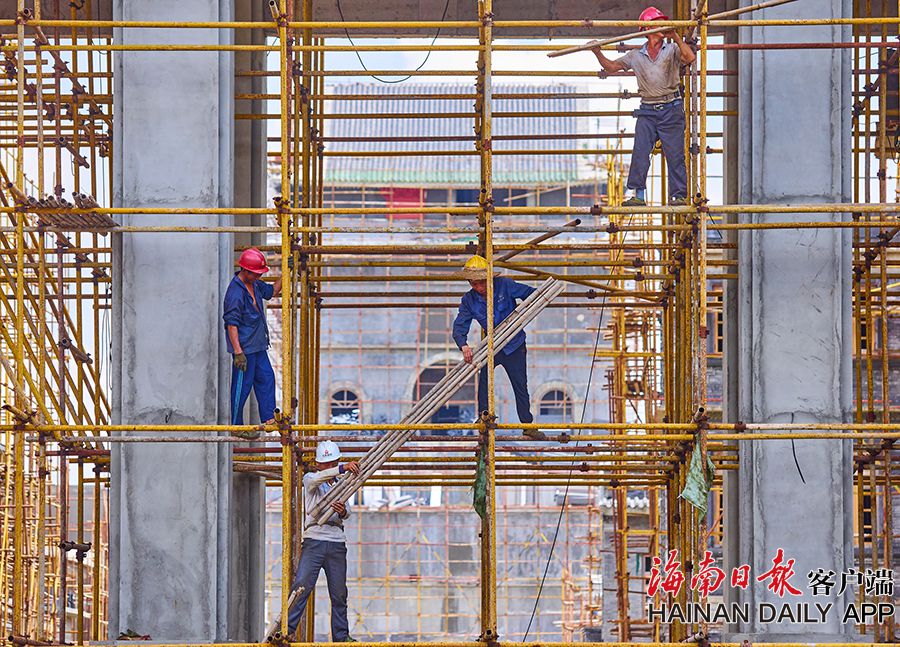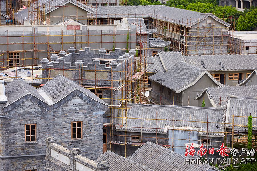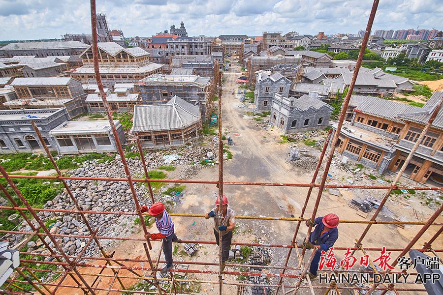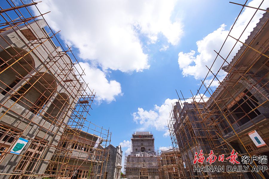 2019年8月28日,海口觀瀾湖電影公社老北京風情街施工現場,工人們正搭設鋼架,以進行隨后的立面裝飾工作。 據了解,電影公社老北京風情街現已完成建筑砌體及抹灰工程,目前主要進行建筑外立面裝飾工作,進度已達70%,并計劃于2020年6月30日前完成整體園林及綠化工程,具備開放展示條件。圖為:電影公社老北京風情街施工現場全貌。(海南日報 見習記者 封爍 攝)