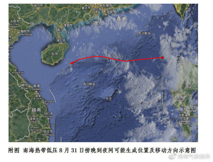 據(jù)監(jiān)測,目前位于巴士海峽附近海面的熱帶云團快速向偏西方向移動,將于今天(8月31日)傍晚到夜間進(jìn)入南海東部海面,并可能加強為熱帶低壓,低壓生成后將以每小時25公里左右的速度向偏西方向移動,可能于9月1日加強為今年第13號臺風(fēng)(熱帶風(fēng)暴級),2日逐漸向海南島東部沿海靠近,3~5日,該熱帶氣旋仍可能在海南島近海回旋,將給海南省帶來長時間的風(fēng)雨天氣。