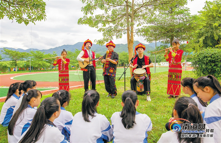 黎人文化公司在五指山思源實(shí)驗(yàn)學(xué)校跟學(xué)生開展文化交流活動(dòng),傳承民族文化。