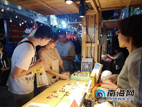 記者在現場看到,不同主題的攤位一路排開,每個攤位都布置了“星星燈”,烘托出溫馨浪漫的氛圍。手工作品、潮流服飾、工藝禮品、民俗作品、花藝等特色產品琳瑯滿目,吸引不少市民游客圍觀、購買。此外,還有潮流音樂等時尚元素加入市集,創意潮流和傳統老街的結合擦出了精彩火花。今年第三次參加海口騎樓老街中秋主題活動的攤主關頌告訴記者,內容豐富的活動吸引不少市民、游客,他也希望以此為契機展示自己原創的手工藝品,“實用的卡包、寓意好的鑰匙扣都比較受歡迎,今晚已經賣了幾件孤品了。”關頌說道。