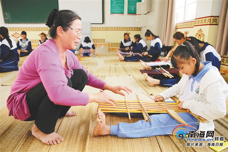 秋季學期開始,在昌江民族中學的課堂里,學校外聘的10名黎錦傳承人又站上了講臺,為教室里年輕的黎族少年們教授起織錦這項黎族傳統技藝。