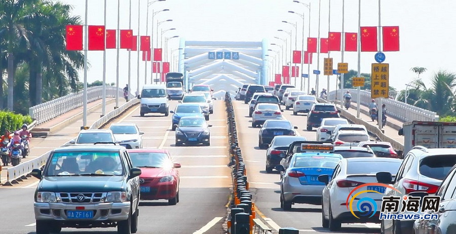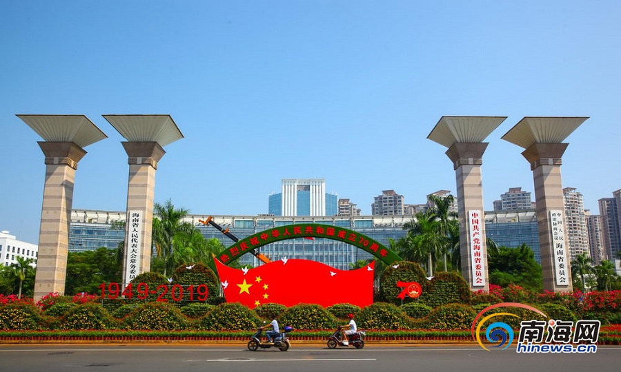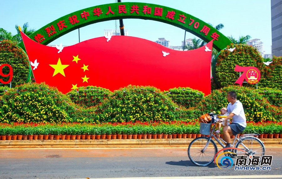 國旗鮮花扮靚海口街頭。海報集團全媒體中心記者 張茂 攝