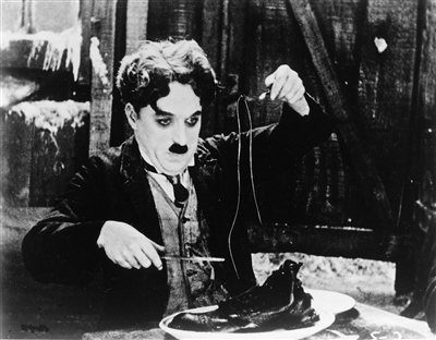 影片《淘金記》對于人物心理幻境的表現(xiàn),無論是從情節(jié)設(shè)計還是在情感表達(dá)上,都達(dá)到了默片電影的巔峰。其中最為影迷津津樂道的一段,無疑是查理為喬治亞演繹的那支“面包舞”——夢境中,熱鬧歡騰的小屋里,查理深情款款地舞動手中的面包,身邊坐著的是心愛的姑娘;現(xiàn)實里,冷清寂靜的餐桌上,查理精心準(zhǔn)備的食物早已沒了熱氣,心上人也不知去向。小人物堅強(qiáng)樂觀的外衣下無法掩藏的心酸與無奈,通過這一段黑白鏡頭向觀眾娓娓道來。