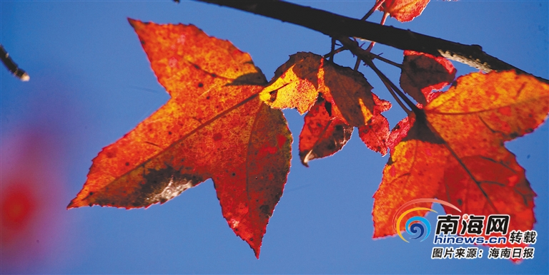 隔著一道長長的海峽,冷空氣長途奔襲至瓊島腹地時,已是兩三個月后。此時北國的紅葉伴著一場場冬雪的降臨而簌簌飄落,五指山的成片楓林這才不緊不慢地換上“紅妝”,成為秋冬時節難得的一抹亮色。