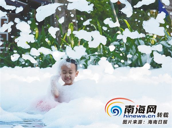 個性化服務添彩海南旅游。12月18日,小游客在三亞市一家酒店噴灑泡沫的泳池內玩耍。海南日報記者 李英挺 攝