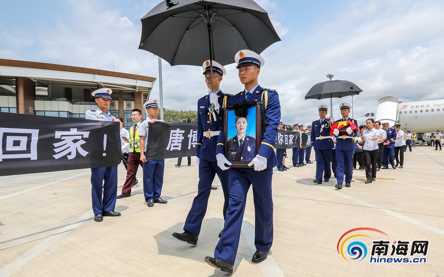 撲火英雄唐博英烈士回家4月5日13時25分,消防戰(zhàn)士手捧唐博英烈士的遺像和骨灰走向車隊(duì)。當(dāng)天13時10分,唐博英烈士的骨灰從四川成都飛抵三亞,來自三亞、陵水等地各界干部群眾、官兵等200余人在機(jī)場迎接撲火英雄回家。13時30分,護(hù)送唐博英烈士骨灰的車隊(duì)從三亞機(jī)場出發(fā),許多群眾自發(fā)的在沿途路邊向英雄致敬。15時許,車隊(duì)抵達(dá)烈士的家鄉(xiāng)陵水黎族自治縣本號鎮(zhèn)時,近萬名群眾手拉橫幅、手捧鮮花肅立道路兩旁迎接英雄回家。15時20分,唐博英烈士追思會在他家中舉行,社會各界群眾在會場沉痛悼念。約16時30分,本號鎮(zhèn)下起小雨,但在唐博英烈士靈堂前吊唁的人群仍絡(luò)繹不絕。