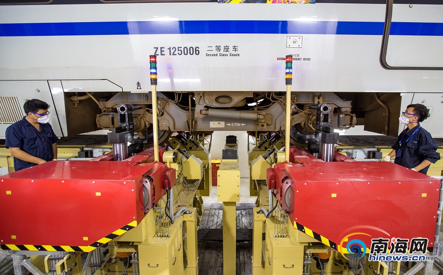 2019年01月19日三亞 提質(zhì)增效 保安全 迎春運(yùn) 1月19日晚,工作人員在鏇輪車庫,操作雙軸不落輪鏇床,進(jìn)行動車組輪對踏面鏇修。 據(jù)悉,今年1月21日進(jìn)入春運(yùn),春運(yùn)期間海南環(huán)島高鐵線預(yù)計(jì)發(fā)送旅客436萬人,日均發(fā)送10.9萬人,最高峰時將使用20組動車組滿圖開行58對。 為提質(zhì)增效,有力保障春運(yùn)安全,廣州動車段三亞動車運(yùn)用所經(jīng)過近半年的安裝調(diào)試,將雙軸不落輪鏇床投入使用,把動車組輪對踏面鏇修的工作效率提高一倍,工時由原來的48小時/組提升到24小時/組。 他們正在做好動車組各項(xiàng)系統(tǒng)的春運(yùn)前普查、檢修,確保車組在春運(yùn)期間的安全運(yùn)行;并制定應(yīng)急預(yù)案,成立小分隊(duì),確保線上發(fā)生故障及時處置。全所干部職工春運(yùn)期間全員在崗,確保動車所各項(xiàng)工作的有序進(jìn)行。