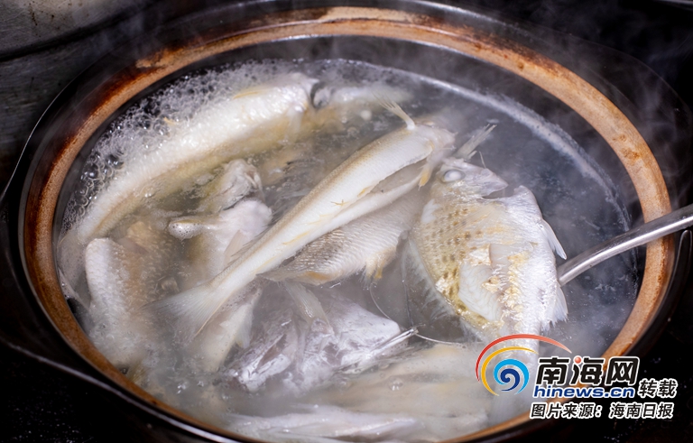 中國人講究大味至淡,小海鮮魚湯算是將其發揮到了極致。小海鮮魚湯也被稱為小海雜魚湯,一個“雜”字透出玄機,這種魚湯必須是幾種魚雜合在一起煮,各種魚的鮮味相輔相成、鮮上加鮮。小海鮮魚湯的主料是產自小海的鯔魚、小紅魚、白鰭魚、沙針魚、立魚、打鐵魚、洛仔魚等。選幾種小海魚去內臟去鰓洗凈,砂鍋文火慢煮,蔥姜等一般魚湯中用來壓腥的調料是不需要的,最多就是加少許鹽,就能煮就一鍋甘甜、鮮美、清香的魚湯。敢這么任性地烹飪魚,只能說萬寧人對自家的新鮮食材有著巨大的自信。不信的話,你先喝一口飄著魚油花的魚湯,嘗一口滑嫩的魚肉再說。