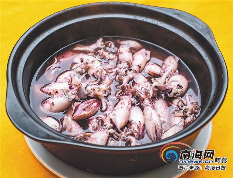 萬寧人有著敢闖敢干的精神,這在萬寧飲食上也有所體現。西餐中的魷魚墨汁飯、墨汁意大利面頗受歡迎,萬寧人也發現了墨汁的鮮美和營養價值,但烹飪手法是粗獷的、也是大膽的。選用兩個拇指大小的新鮮魷魚,不去墨汁洗凈后直接入鍋水煮,一鍋烏黑的墨汁湯泡著圓滾飽滿的小魷魚,別看賣相有點嚇人,吃起來可是鮮掉眉毛。