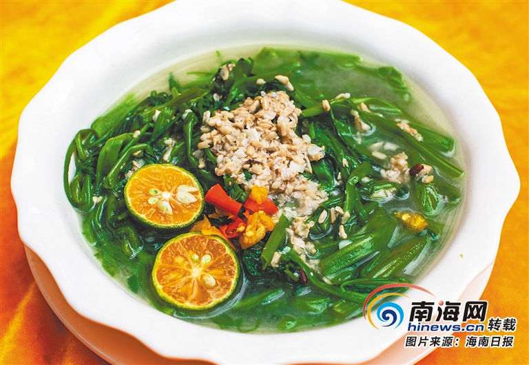 萬寧人善于組合不同的食材,把那些不起眼的食材也做成美味佳肴。龍滾菜的主料是粉絲和韭菜,但油爆香的魷魚干和蝦米是提升這道菜鮮香的關鍵。炮彈魚肉質粗硬,但在加入五花肉和蘿卜干燉煮后產生了奇妙的變化。哪怕是最常見的通心菜,萬寧人也能吃出花樣。在物質不豐富的年代,釀酒剩下的糟粕也不能浪費了,通心菜滾水燙過,馬上放到涼水里泡著才能保持青翠欲滴的色澤,撈起扭干水分,切成小段,淋上糟粕,這是基礎版的腌通心菜。不同的人家會根據不同的嗜好給這碗腌通心菜注入不同的靈魂,燉肉的肉汁和煲魚的魚汁添到通心菜里,那可是完全不同的味道。