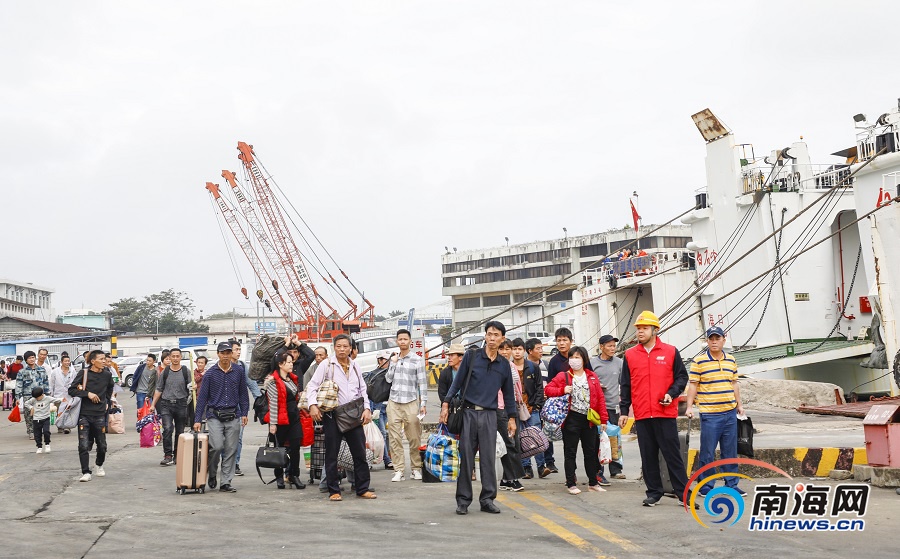 1月10日上午,春運(yùn)首日,海口秀英港碼頭內(nèi),旅客準(zhǔn)備登上瓊州海峽紫荊十二號(hào)客滾船。南海網(wǎng)記者 李昊 攝