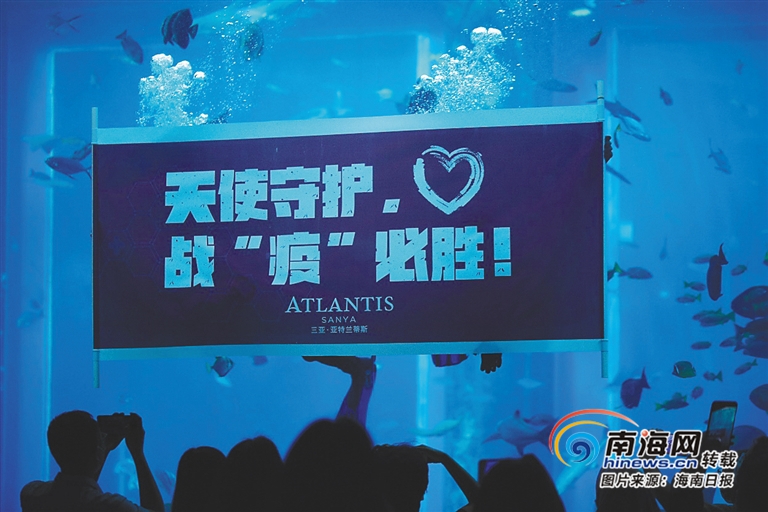 三亞·亞特蘭蒂斯失落的空間水族館用橫幅致敬醫護人員。海南日報記者 武威 通訊員 郭王惠 攝