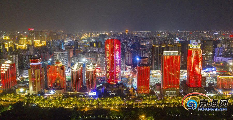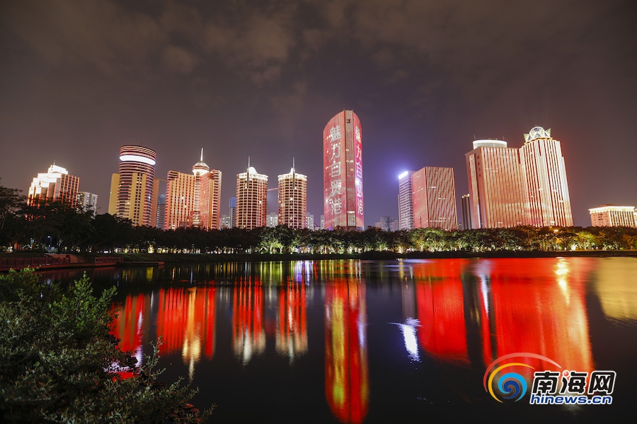 4月13日晚,“共享重大機(jī)遇 共創(chuàng)美好未來”海南自貿(mào)港建設(shè)燈光秀活動(dòng)在海口舉行,濱海大道萬(wàn)綠園附近路段上的大型高層建筑亮起“潮起海之南,逐夢(mèng)自貿(mào)港”“相約自貿(mào)港,共創(chuàng)新海南”“中國(guó)的海南島,世界的自貿(mào)港” 等燈光秀呈現(xiàn)的宣傳標(biāo)語(yǔ)口號(hào)。