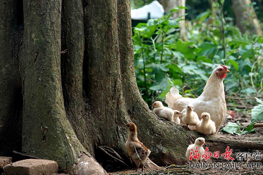 在儋州市大成鎮推賽村,母雞帶著小雞在樹下覓食。