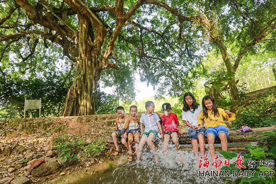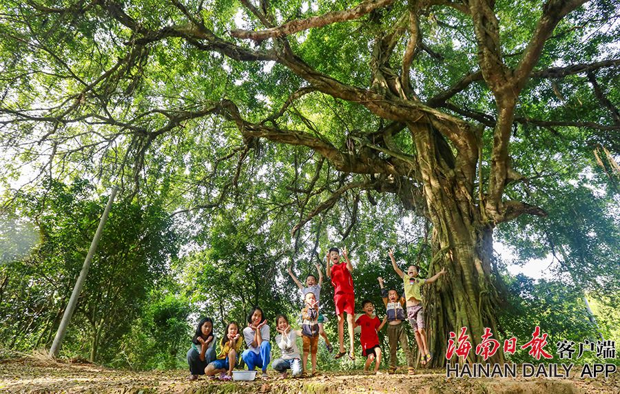 4月11日,在儋州市大成鎮小嶺村委會新坊村,一株300多年樹齡的垂葉榕下,孩子們在玩耍。
