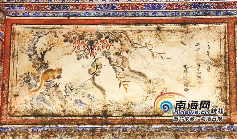 文昌人建造房屋歷來有繪制壁畫的習俗。彩繪不僅有保護墻面的作用,更重要的是人們通過豐富多彩的畫像來表達對美好生活的追求和企盼。林家大院的屋檐下、梁枋間飾有精美的壁畫,以及表現古代名人的詩詞書畫和梅蘭竹菊、花鳥等圖案。有象征喜上眉梢的“喜鵲登梅”;象征高尚品德的松、竹、梅;意喻金玉滿堂的“金魚和海棠”;表示連年有余的“蓮花和鯉魚”等。這些壁畫的色彩雖然有所暗淡,但不剝裂、不脫落,保存較為完整,當年的華麗與繁盛依然清晰可見。拂去歲月的塵埃,一幅幅美麗的、充滿鄉(xiāng)愁的山水、動植物彩繪畫卷,給人以清雅、舒適的美感。
