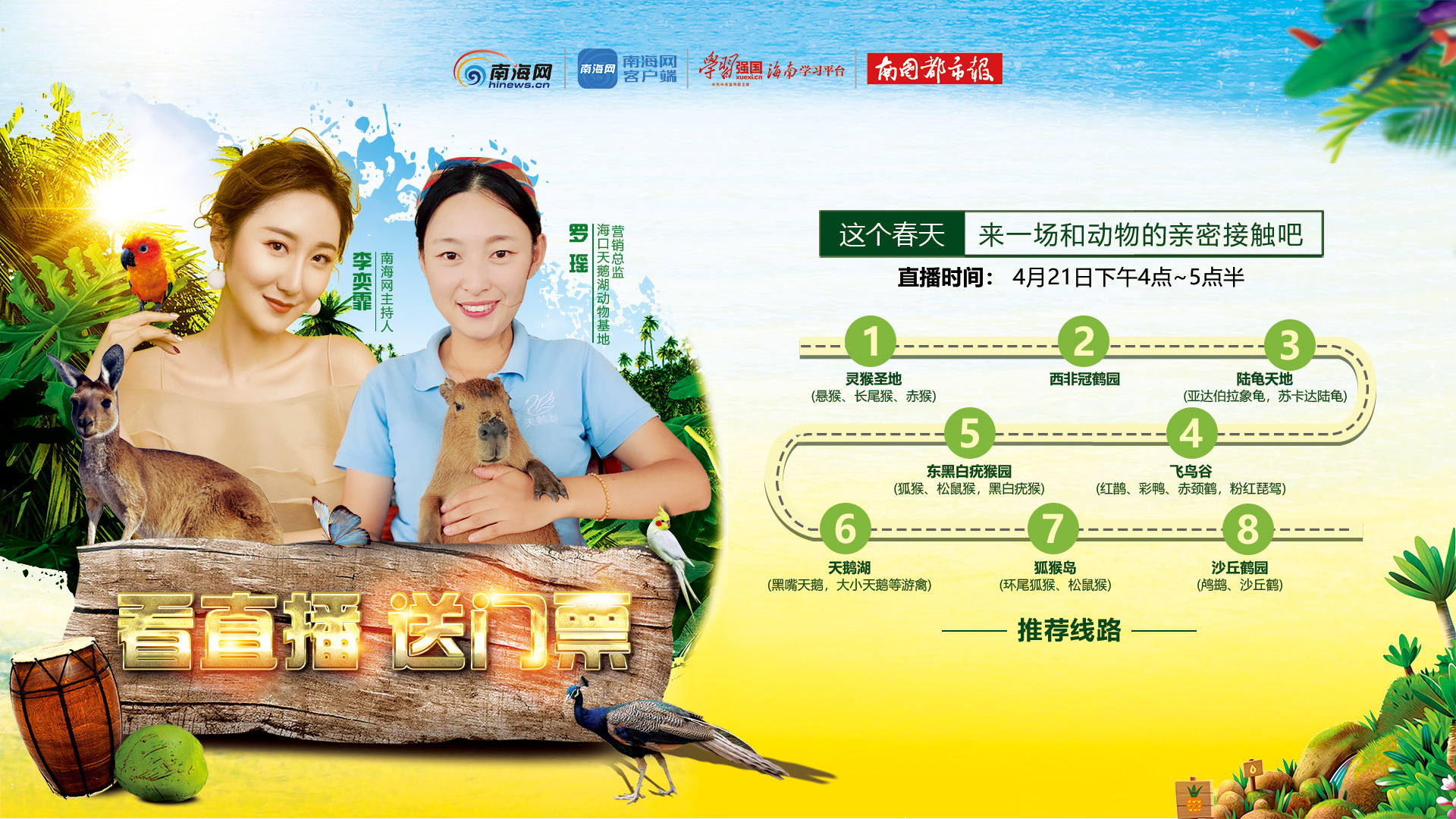 海南旅游頭條、南海網(wǎng)、南海網(wǎng)客戶端、南國都市報海口4月21日消息(記者 韓星)假期將至,來一場和動物的親密接觸吧!4月21日下午4時至5時30分,南海網(wǎng)“椰直播”主播奕霏攜手海口天鵝湖動物基地營銷總監(jiān)羅瑤通過手機(jī)直播帶網(wǎng)友走進(jìn)海口天鵝湖動物基地,一起回歸大自然。直播現(xiàn)場還抽取18名幸運(yùn)網(wǎng)友送出36張基地門票。