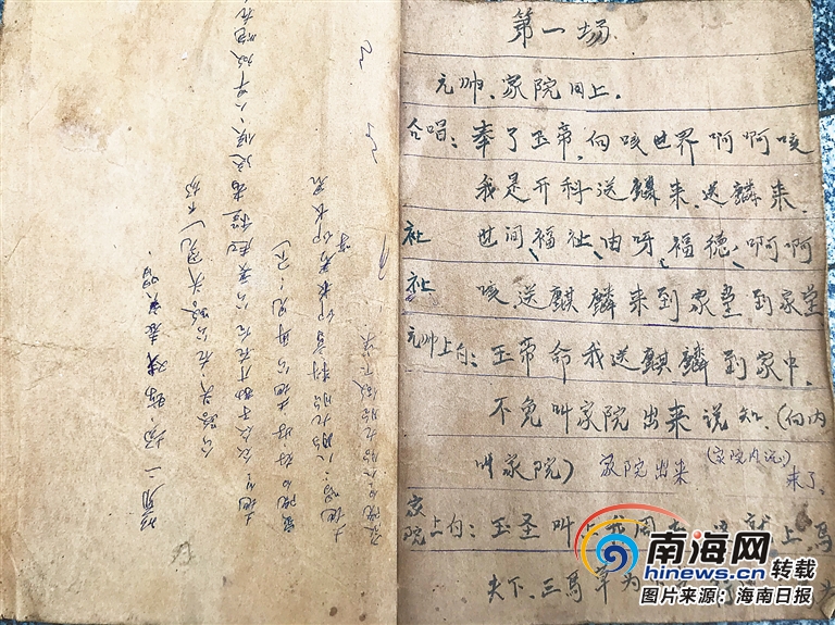 “你看,這就是當年流傳的麒麟舞唱詞手抄本。”吳清河邊說邊向記者展示了一本紙張泛黃卻保存完好的手抄本。他們還根據專家的建議,改用海南話來念白,以便讓更多本地觀眾能聽懂他們的唱詞。