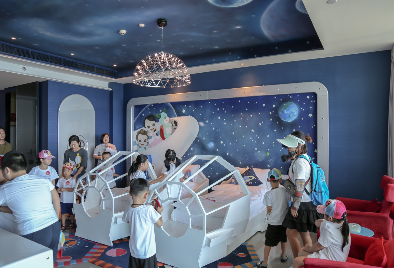 伴隨著涼爽的海風(fēng),三位身穿太空服的“宇航員”為小朋友們帶來了一場別開生面的舞蹈,拉開了探險(xiǎn)之旅的序幕。小朋友參觀了酒店18樓代表著勇敢、善良、感恩、自省的四個(gè)星際聯(lián)盟主題親子套房;在稻草人農(nóng)莊里玩“光影尋寶”游戲;在未來塔草坪上進(jìn)行了家庭親子接力賽和小小賽車手及手搖船競賽,讓大家在比賽中收獲了滿滿的歡樂。