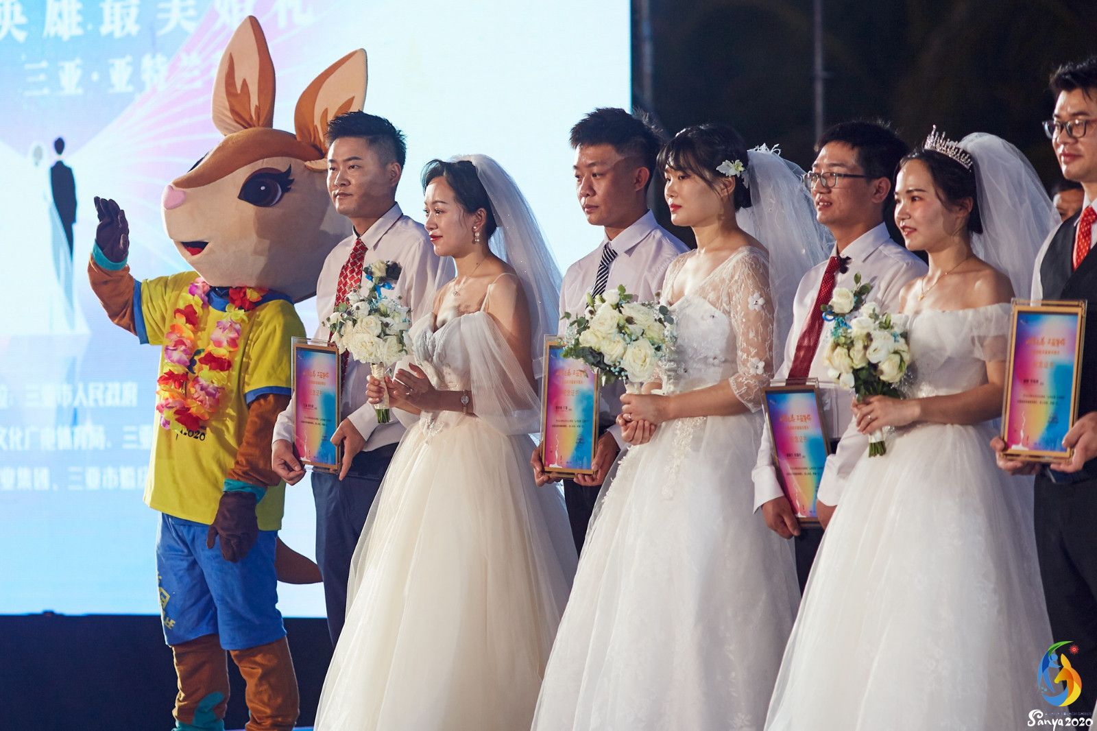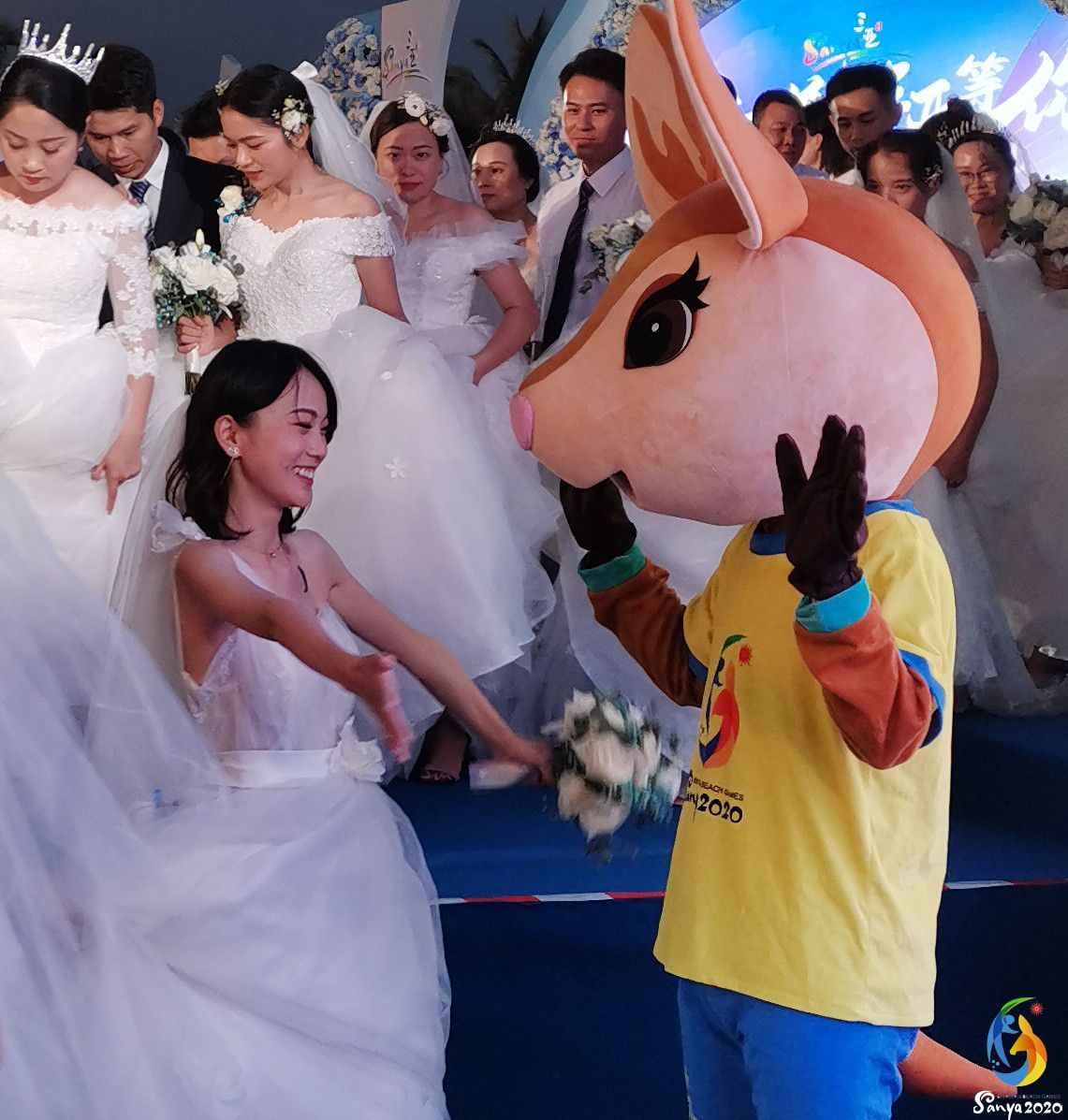6月6日,“山河無恙三亞等你”全國戰疫英雄最美婚禮在三亞亞特蘭蒂斯舉行,來自全國15個省份的百對戰疫英雄新人攜手許下愛的諾言。活動當天,2020年第六屆亞洲沙灘運動會(以下簡稱“亞沙會”)吉祥物“亞亞”成為“證婚使者”,見證百對新人執手天涯盟誓。