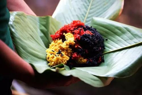 三色棕由黑、紅、黃三色組成,是海南黎苗族特色美食之一,采用黃姜、雞屎藤、紅藍(lán)藤葉無(wú)公害天然染色,配上當(dāng)?shù)靥厣纳教m稻米與黑豬肉制作而成。初出熱鍋的三色粽,香味四溢。