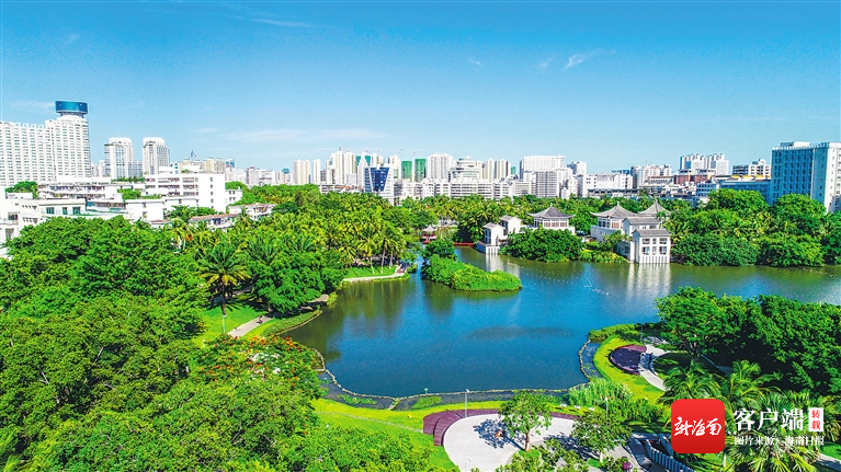 6月18日,藍天白云下,高空俯瞰經過生態修復后的海口東西湖、人民公園一帶景色,水清岸綠的美景盡收眼底。