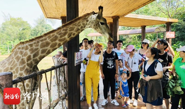 游客在海南熱帶野生動(dòng)植物園和長頸鹿互動(dòng)。記者 石祖波 攝