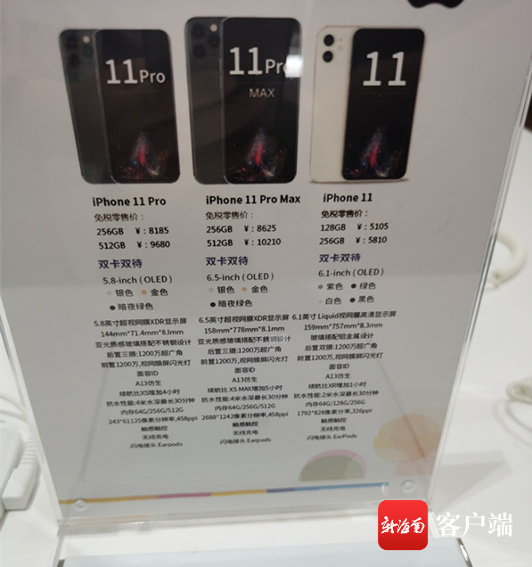 iPhone 11 Pro Max 256GB版本在海南的免稅售價為8625元。其中最便宜的蘋果機型是iPhone 11 128GB版本,售價為5105元,該款手機的蘋果官網售價為5999元。