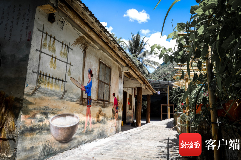 原來,三派村是昌江王下鄉“黎花里”文旅項目中“三里”的第一里——詩里畫里,作為“黎花里”形象門戶、游客集散地,三派村對住宅區、主道路、水系景觀等進行了改造提升,將墻繪藝術與當地自然、人文環境、黎鄉故事相互結合,打造了“流動的黎族文化博物館”,游人步入村中民宅間,制陶圖、織錦圖、舂米圖等生動的黎家生活畫面隨即映入眼簾,徜徉其中更是處處是景觀,戶戶有故事。