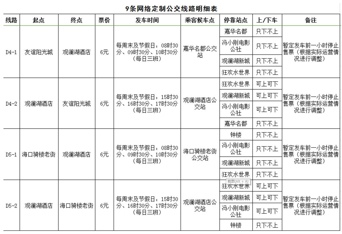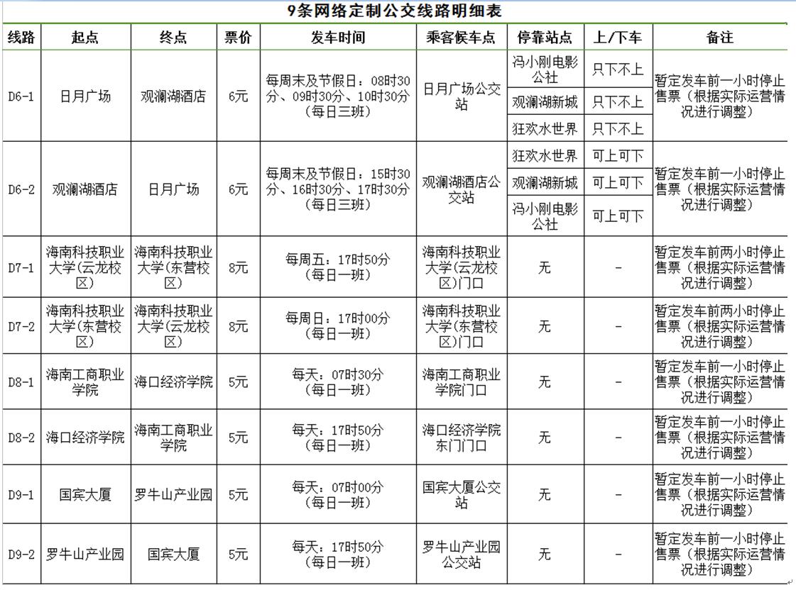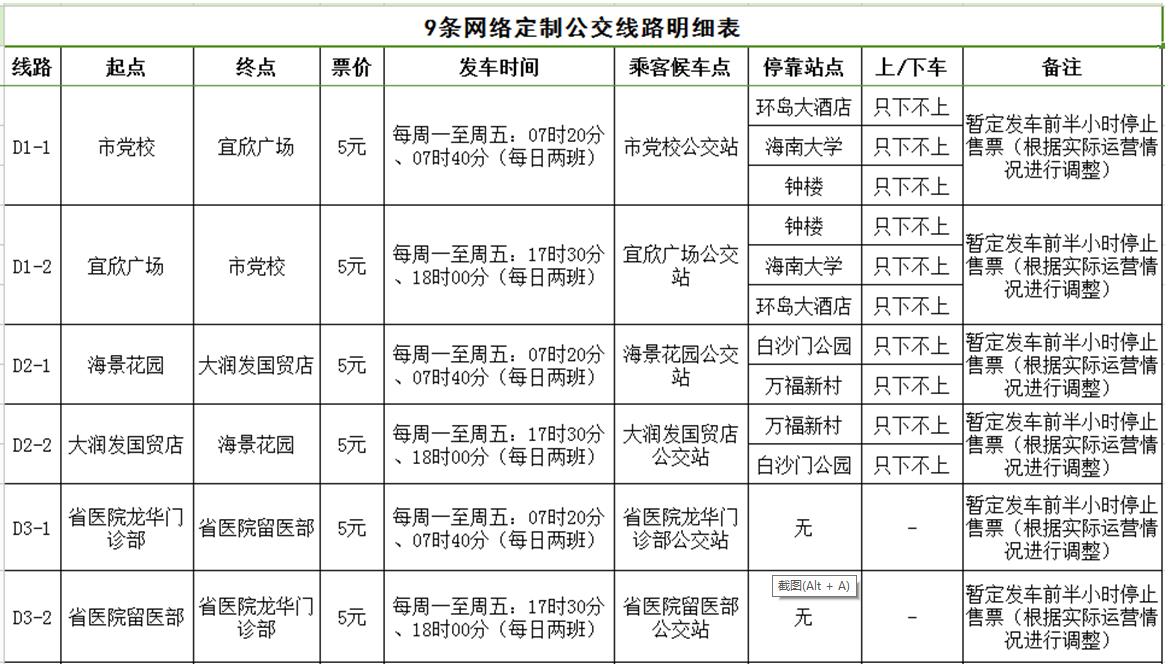 據(jù)了解,海口公交集團(tuán)經(jīng)過充分調(diào)研及需求聚合分析,開通D1(市黨校至宜欣廣場(chǎng))、D2(海景花園至大潤發(fā)國貿(mào)店)、D3(省醫(yī)院龍華門診部至省醫(yī)院留醫(yī)部)、D4(友誼陽光城至觀瀾湖酒店)等9條網(wǎng)絡(luò)定制公交線路。