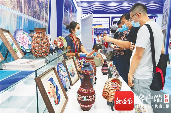 碧海藍天、椰影婆娑間,在文化服務專題展區的海南館內,各家參展企業的項目以及文創產品被富有巧思地陳列展示。海南省陶瓷文化產業協會帶來的紅泥陶瓷器向人們展示著海南陶瓷器的歷史與傳承;三亞海棠灣手工創意產業基地景泰藍手工藝品制作匠人現場演示工藝品制作工藝;色彩艷麗的海南彩雕讓一位位參觀者詢問它的制作原料與工藝……