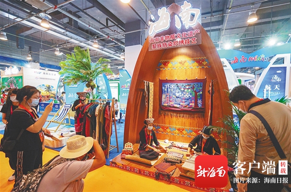 “你們呀諾達景區這個懸崖觀海秋千15歲的孩子能玩兒嗎?有沒有家庭套票?”“請問這個黎族織錦的包包是純手工織的嗎?”“這位女士,您參與‘翻翻樂’抽獎活動獲得一份來自海南的椰子食品,恭喜您!”……旅游服務專題展區內的海南館里,耳邊除了傳來頗具海南特色的本土音樂聲,還能聽到觀眾各類咨詢和互動交流的聲音,口音天南地北、各不相同。
