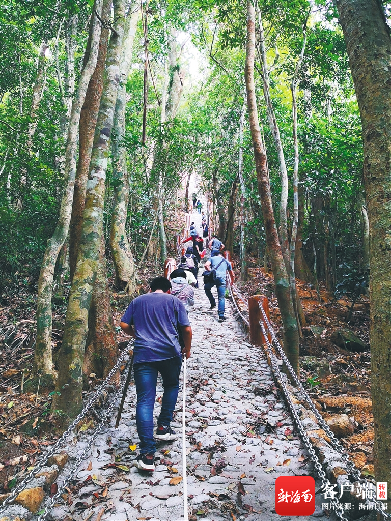 在黎母山,有一條新修建成的石頭棧道。采訪團(tuán)成員從山腳開始,沿著棧道向上攀登。走了20多分鐘的平緩道路之后,是一段117米長(zhǎng)的陡坡,必須借助棧道上設(shè)置的繩子才能向長(zhǎng)攀爬。