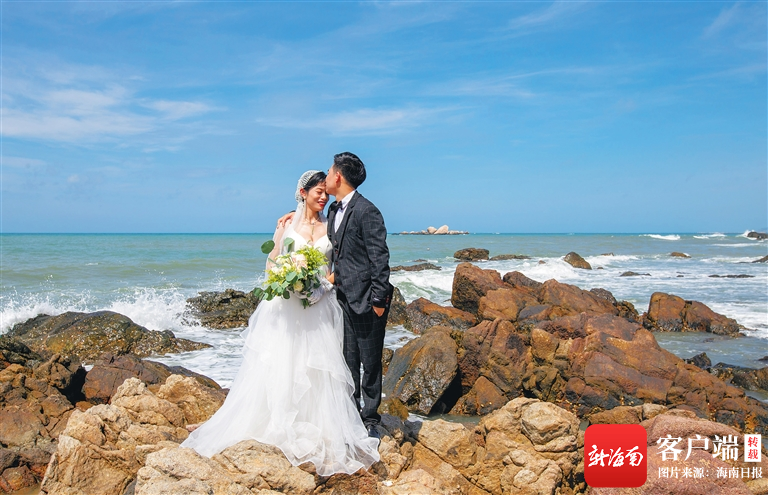新人在三亞天涯海角游覽區婚拍基地拍攝婚紗照。海南日報記者 武威 攝