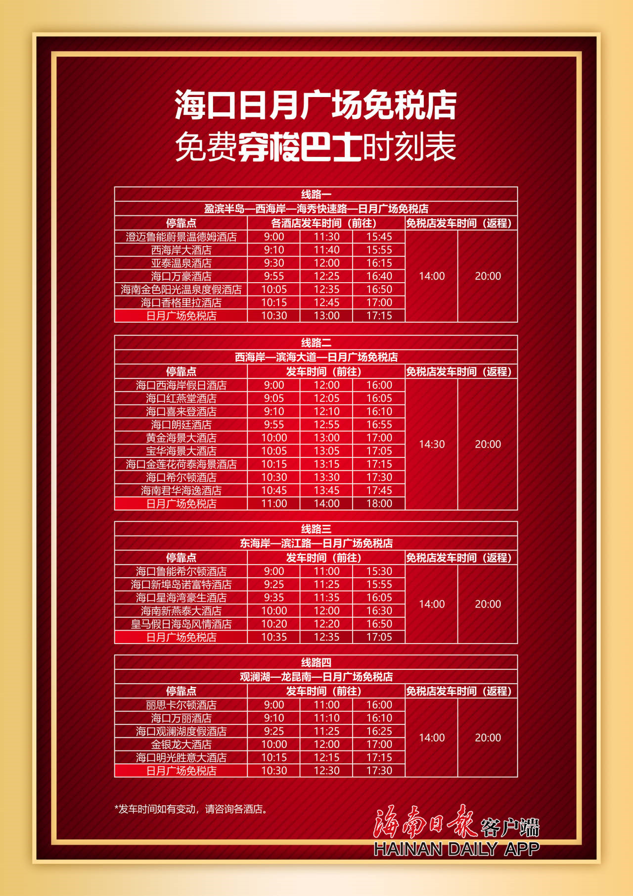 據(jù)了解,此次免費(fèi)穿梭巴士的路線(xiàn)途徑盈濱半島、西海岸、東海岸、觀(guān)瀾湖等海口四大酒店集結(jié)區(qū),包括海口萬(wàn)豪酒店、香格里拉酒店、喜來(lái)登酒店、希爾頓酒店、麗思卡爾頓酒店等多家高端度假型酒店。首班最早9:00從酒店發(fā)車(chē),一天三趟,旅客自由選擇出行時(shí)間,最晚20:00從日月廣場(chǎng)免稅店啟程返回,班次多、選擇空間大,為廣大旅客預(yù)留了充足的買(mǎi)買(mǎi)買(mǎi)購(gòu)物時(shí)間。