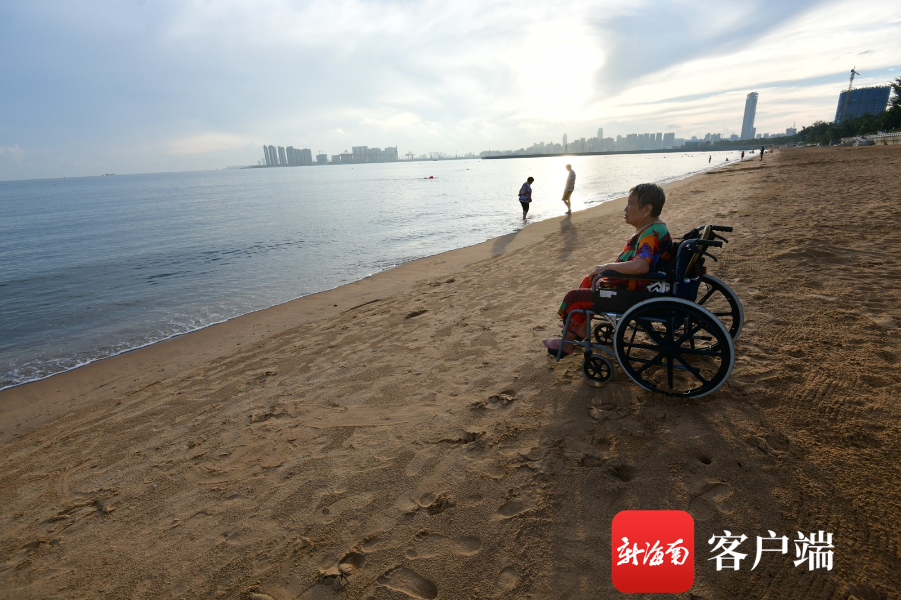 9月13日,西秀海灘,一老人在家人的幫助下,坐著輪椅在海邊欣賞西海岸風光。