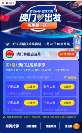 9月16日,澳門特區宣布加入飛豬百億補貼活動,澳門機票實行買一送一的優惠折扣。活動上線首日,澳門目的地在飛豬平臺上的相關搜索量增長超過570%。其中,上海人購買去澳門機票占比最高,廣東人預訂澳門各大高星級酒店的人數最多。
