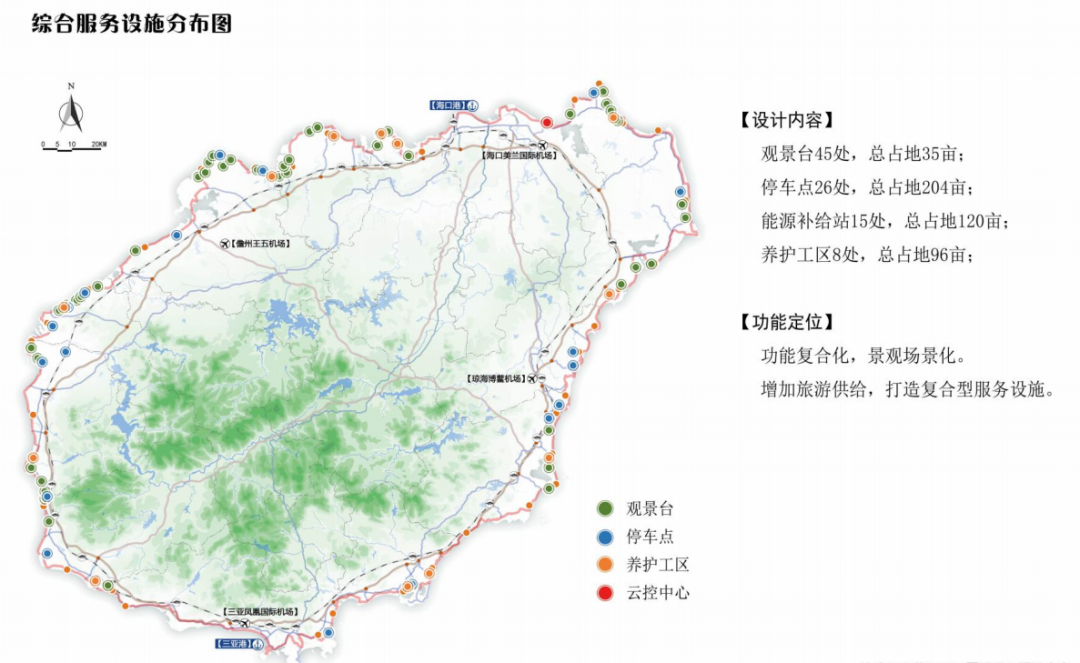 項(xiàng)目投資估算約為167億元,建設(shè)資金采用“交控自籌+政府支持+社會(huì)資本+市場(chǎng)融資”方式解決,主要建設(shè)內(nèi)容包括路基路面、橋梁涵洞、路線交叉、交通工程及沿線設(shè)施、環(huán)境保護(hù)與景觀設(shè)計(jì)、旅游服務(wù)配套設(shè)施等。其中景觀提升設(shè)置觀景平臺(tái)45處、停車區(qū)26處、養(yǎng)護(hù)工區(qū)8處、新能源補(bǔ)給站15個(gè)、慢行道67公里,同步打造2個(gè)智慧公路示范段36.34公里(文昌30公里、瓊海博鰲6.34公里)。