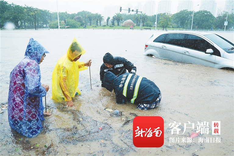 10月18日,三亞出現強降雨天氣,下洋田一路路口積水嚴重,住建部門派出市政維護應急中心工人正在清理下水道口,緊急排水方便市民出行。海南日報記者 武威 攝