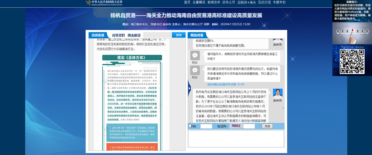 11月25日下午,海關總署門戶網站通過視頻連線的方式圍繞“揚帆自貿港——海關全力推動海南自由貿易港高標準建設高質量發展”這一主題開展在線訪談。(網站截圖)