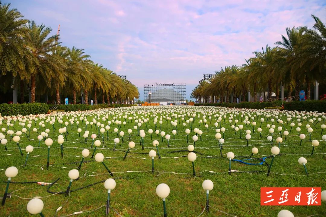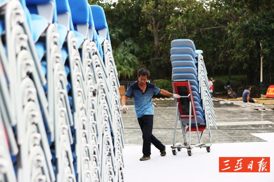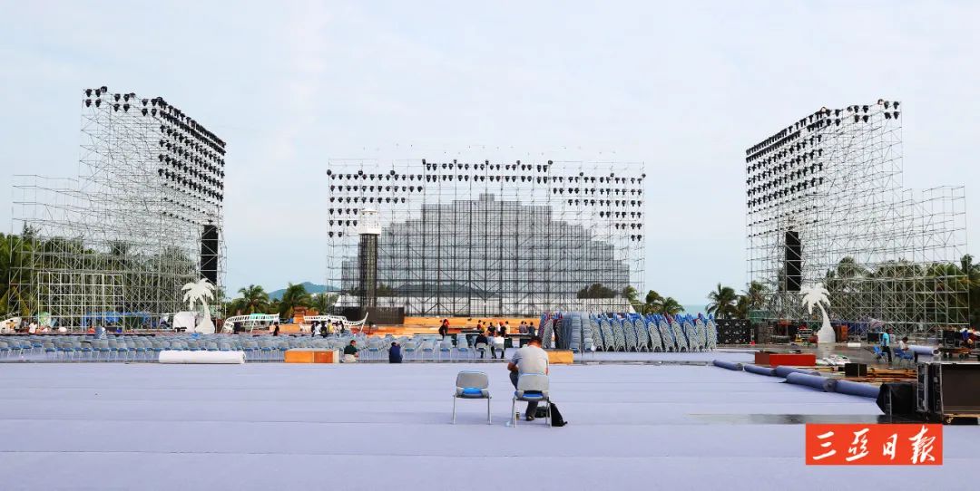 舞臺(tái)前擺放的椰樹(shù)、電影膠卷等裝飾品呈現(xiàn)著椰風(fēng)海韻,“影”味十足。舞臺(tái)下紅色和藍(lán)色的座椅也被整齊排開(kāi),屆時(shí)現(xiàn)場(chǎng)可容納近3100人觀禮。