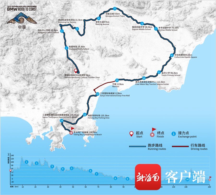 據組委會介紹,2020BMW越山向海人車接力海南年終巔峰賽將于12月12日零點準時起跑,比賽將持續24個小時,12月12日24:00賽事結束?;顒訉谋Mぱ街Z達雨林文化旅游區出發,歷經晝夜156.5公里奔跑,最終抵達“天下第一灣”亞龍灣廣場海灘。選手可以盡情領略海南獨有的熱帶雨林和海濱風光,而沿途豐富的民俗舞蹈、傳統節慶及賽道補給更可以讓參賽跑友深入感受海南獨特的少數民族風情和當地人文文化。