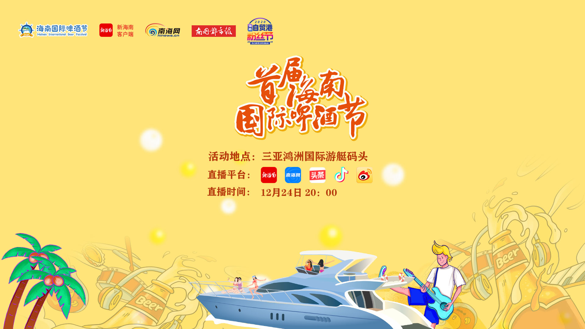 作為2020年第二十一屆海南國際旅游島歡樂節的重要內容之一,首屆海南國際啤酒節的直播中將帶大家觀看海上游艇巡游、尾波沖浪、全場燈光秀、無人機表演、煙花秀等表演,邀請了音樂制作人Casper卡斯柏、Stella183、貓魁等DJ,在現場開啟超燃海上蹦迪狂歡派對。