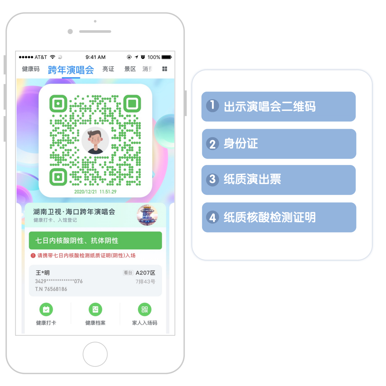 本通告所指的實名制入場是指在入場時本人持身份證、演出票、核酸檢測證明及跨年演唱會二維碼。不是本人身份證購票完成上述動作后也可入場。