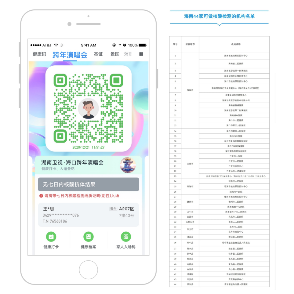 12月22日,海口發布《湖南衛視2020-2021跨年演唱會期間疫情防控工作的通告》,明確凡當天進入體育場的人員須嚴格落實“預先健康申報”“體溫檢測”“7天內核酸檢測證明”“實名制入場”“全程戴口罩”“對號入座”六個100%要求。