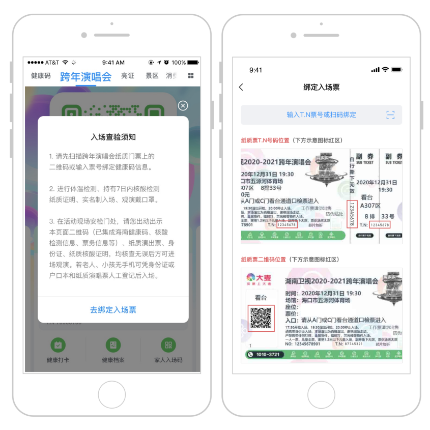 掃描跨年演唱會紙質門票上二維碼或輸入票號綁定健康碼信息(票號在下方事宜圖標紅區)