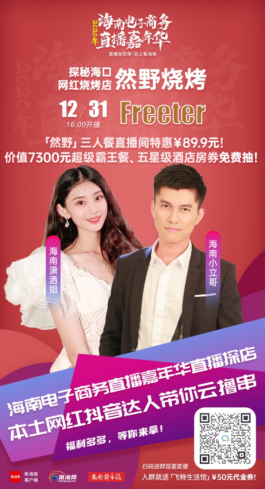 12月31日16時, 首期將由海南本土網紅抖音達人“海南瀟灑姐”“海南小立哥”化身美食達人,帶你探店這家位于海口華海路上的網紅燒烤店——然野燒烤,直播間不僅美食誘人,而且福利多多。